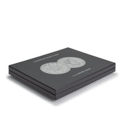 1 1/2"). 1 tray with black, velour-like surface and 20 round cavities (Ø 44,2 mm / 1 3/4"). Silver-coloured printing on lid and cushion with coin design. The lid cushion is covered in black satin. Secure and unobtrusive magnetic fastener.