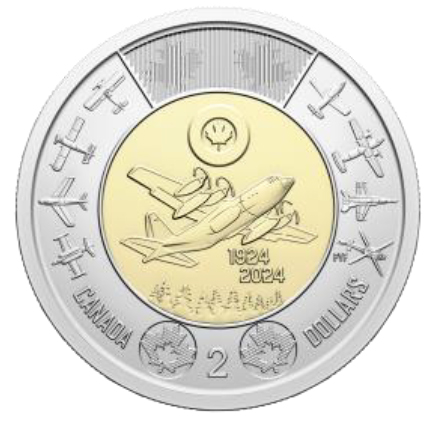 A century of service captured on a coin. On each $2 commemorative circulation coin’s reverse, the RCAF’s first century (1924-2024) is seen through the lens of services its personnel and equipment have brought – and continue to bring – to Canada and the world.