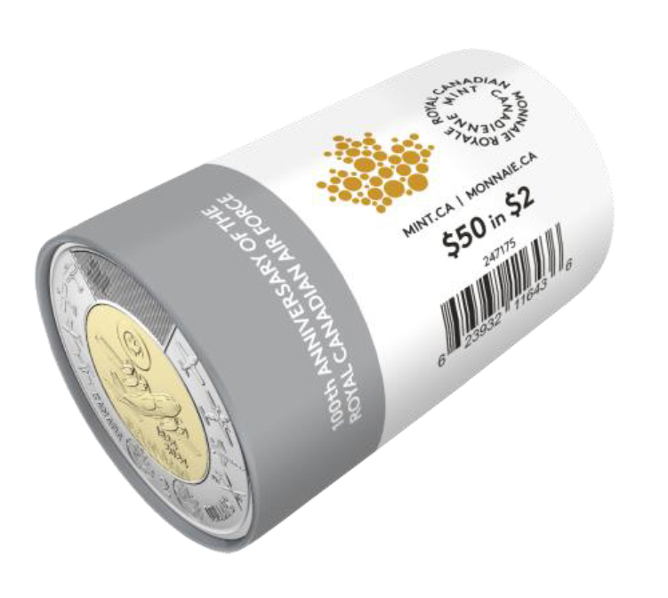 As Canada’s Air Force marks its centennial, the $2 100th Anniversary of the Royal Canadian Air Force commemorative circulation coin features a design that spans 100 years of RCAF missions, machinery and milestones. Each Special Wrap Roll contains 25 $2 coins featuring historic RCAF aircraft, past and present, that have been used to perform different roles throughout the RCAF’s first century of service – from air defence to search-and-rescue efforts.